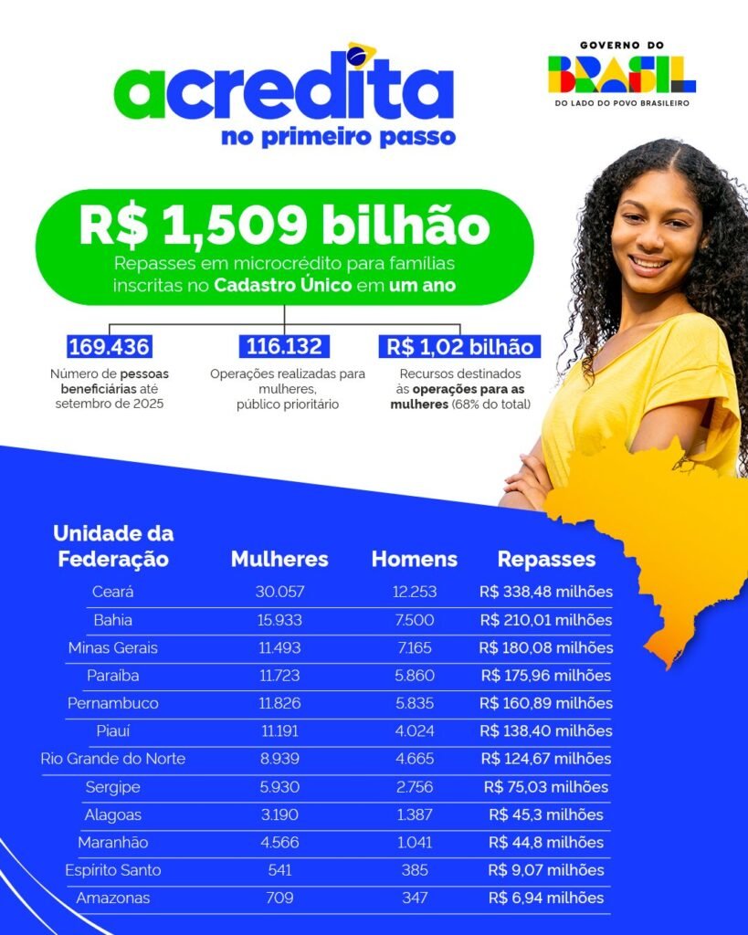 Programa nacional de impacto social Em nível nacional, o Acredita no Primeiro Passo consolidou-se como uma das políticas de maior alcance social do Brasil. Foram mais de 169 mil operações de microcrédito e R$ 1,5 bilhão em repasses realizados em apenas um ano. Adicionalmente, 68% dos recursos foram destinados a mulheres, público prioritário da política pública. No Amazonas, 709 beneficiárias eram mulheres e 347, homens, o que demonstra o protagonismo feminino na geração de renda.