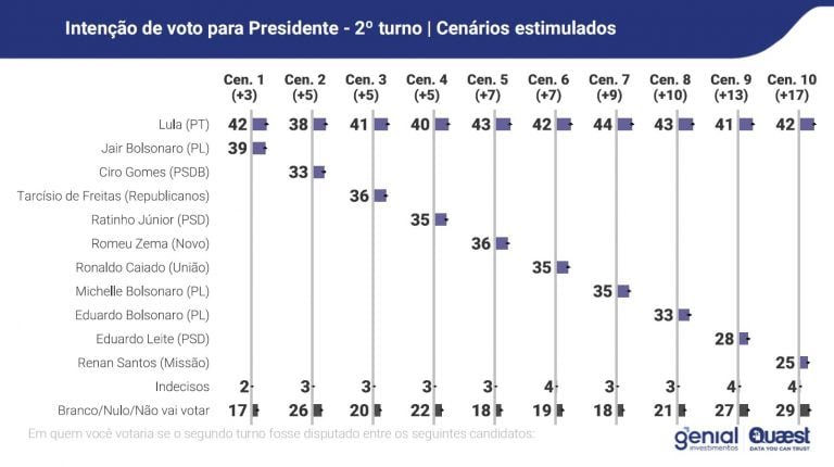 Além disso, contra Eduardo Leite (PSD) e Eduardo Bolsonaro (PL), Lula mantém margem superior a dez pontos percentuais. Entretanto, em um confronto direto com Jair Bolsonaro, o resultado mostra um empate técnico, dentro da margem de erro.