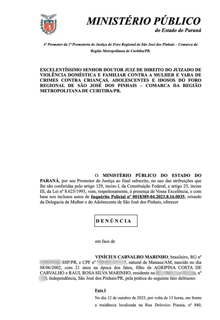 Histórico de violência doméstica reforça gravidade do caso A denúncia atual não representa um caso isolado. Vinicius Carvalho Marinho já responde por outros episódios de violência doméstica, inclusive contra a mãe de sua filha.
