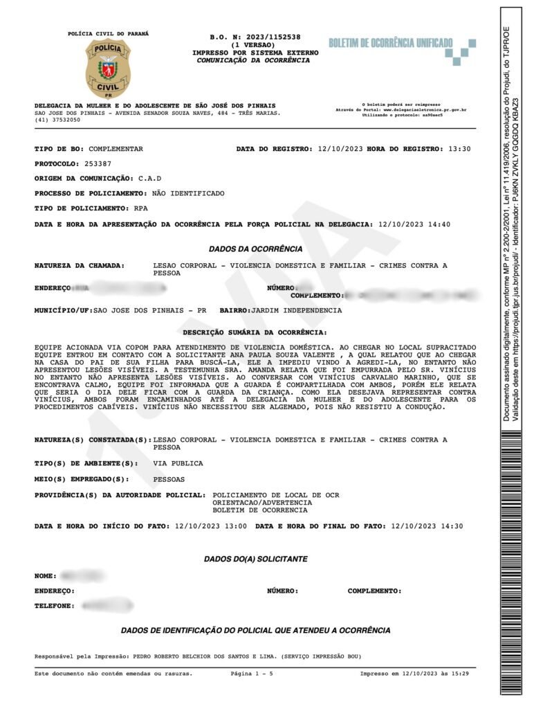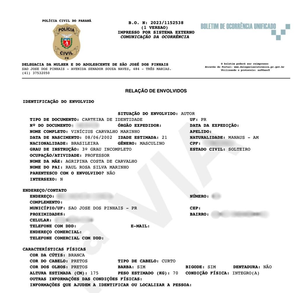Segundo a vítima, Vinicius puxava seus cabelos, a ofendia com palavras de baixo calão e a submetia a humilhações constantes. Além disso, familiares do agressor reforçavam o abuso psicológico ao compará-la repetidamente com a ex-companheira dele.