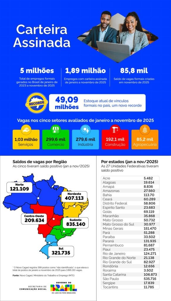 Brasil supera 5 milhões de empregos formais no período No cenário nacional, o país criou 5.028.124 empregos com carteira assinada entre janeiro de 2023 e novembro de 2025. Nesse intervalo, o saldo de novembro foi positivo em 85.864 vagas, resultado de 1.979.902 admissões e 1.894.038 desligamentos.