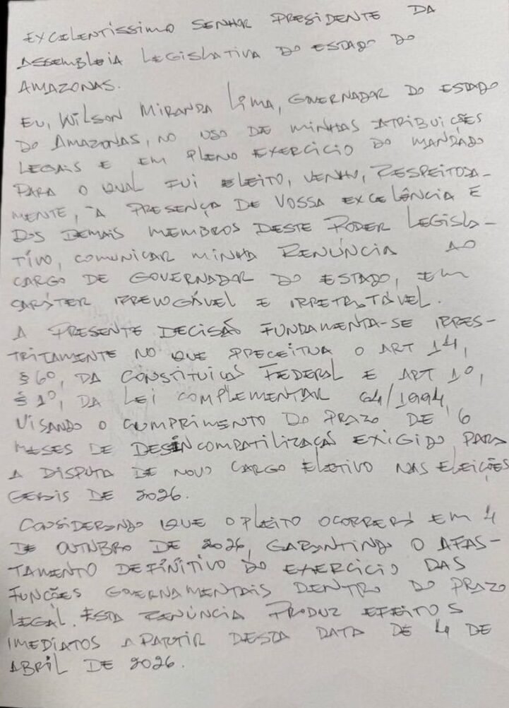 Renúncia simultânea surpreende o Amazonas A renúncia de Wilson Lima e Tadeu de Souza mudou, de forma imediata, o cenário político do Amazonas. O anúncio ocorreu na virada da noite e, por isso, pegou aliados e adversários completamente de surpresa.